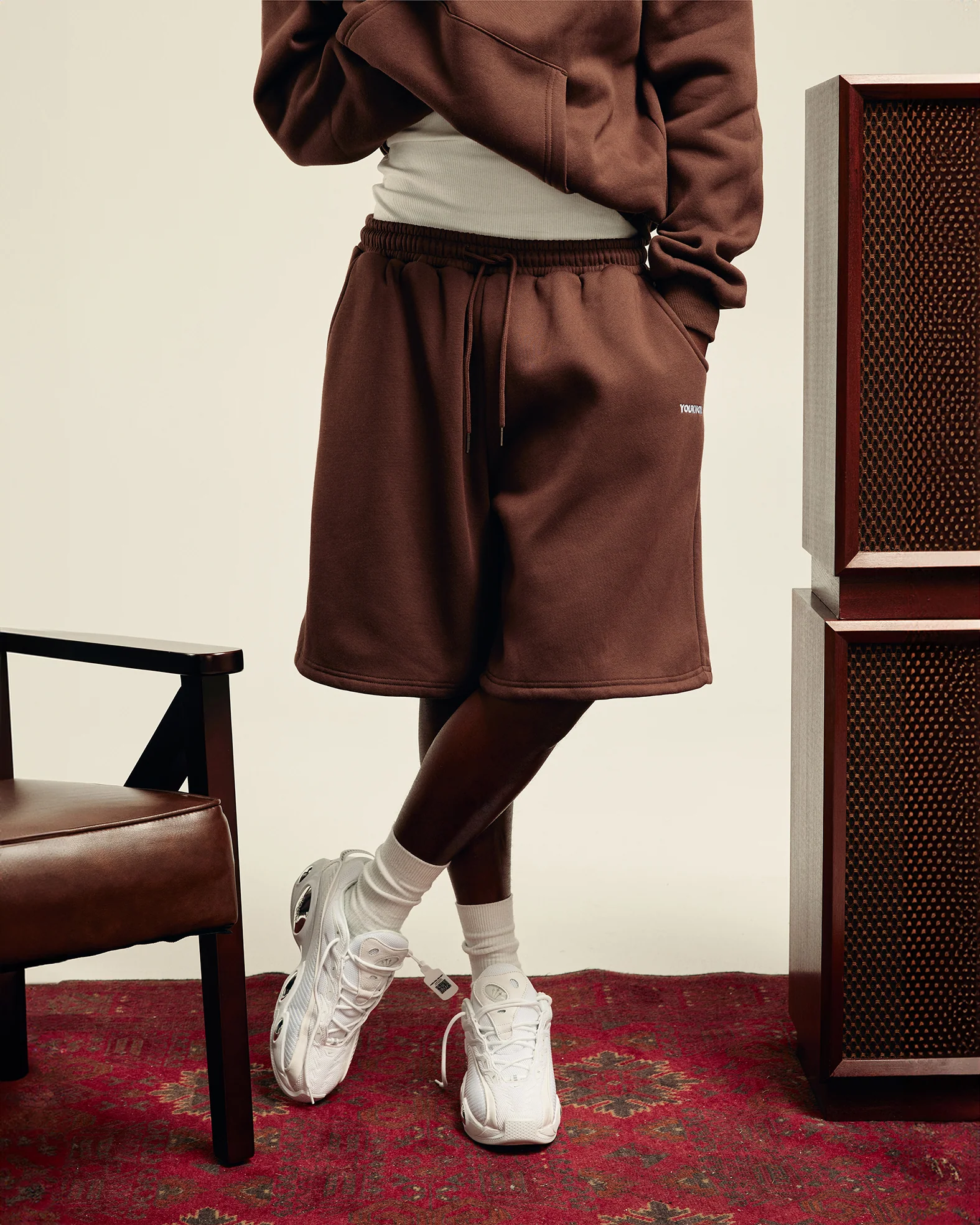 - Elasticated waist shorts- featuring embroidery on the front and back. Part of a versatile set including hoodie, crew, tee, and wide-leg pants.