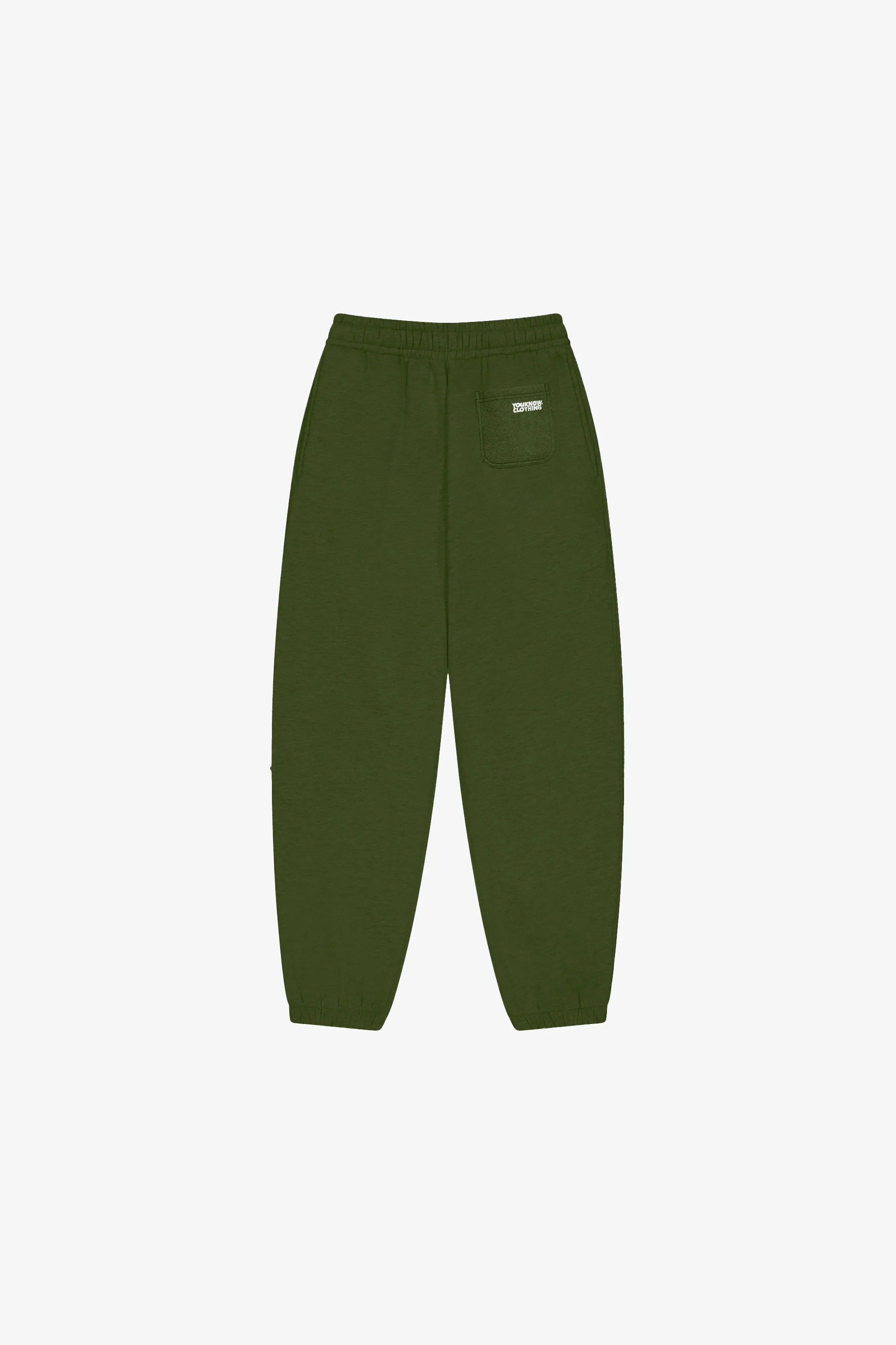 - Cuffed sweatpants with puff print and embroidered logo, part of a versatile set including hoodie, crew, tee, and wide-leg pants.